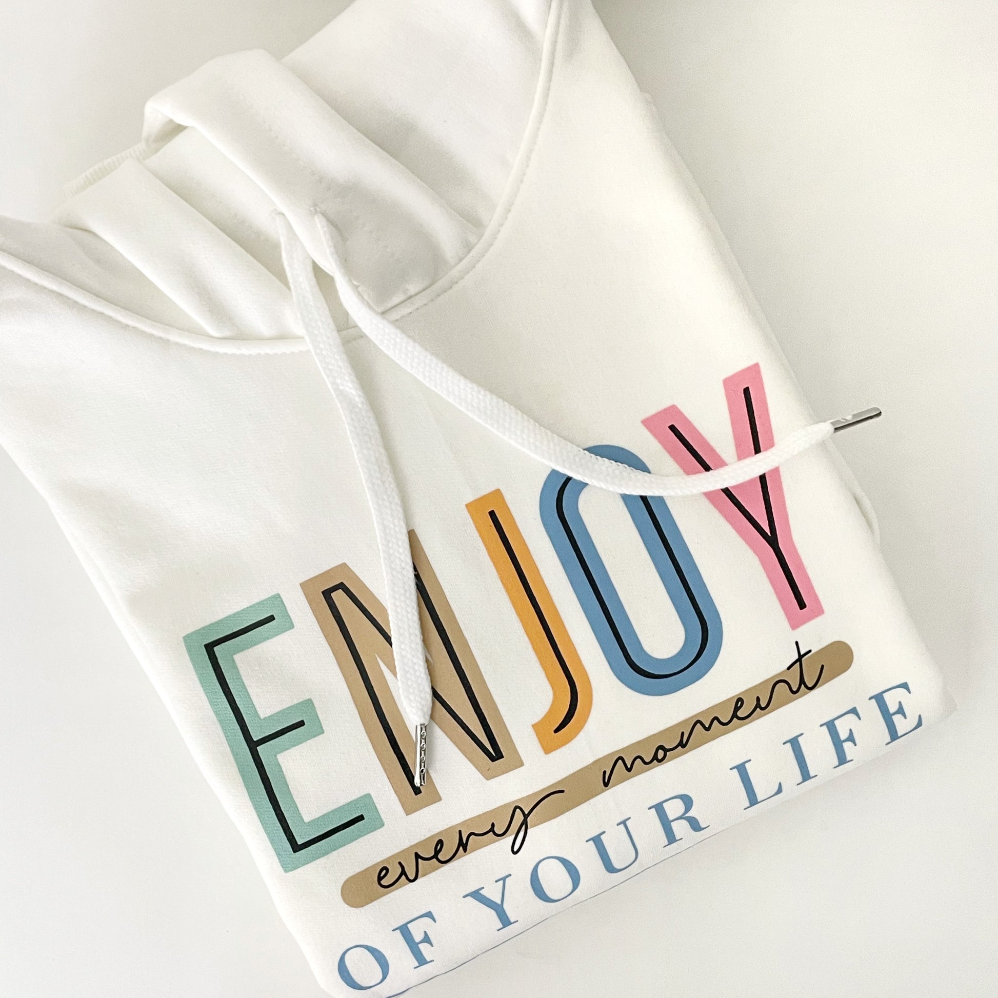 Hermosa polera de grande la unisex con capucha amplia forrada y bolsillo delantero: Enjoy every moment of your life