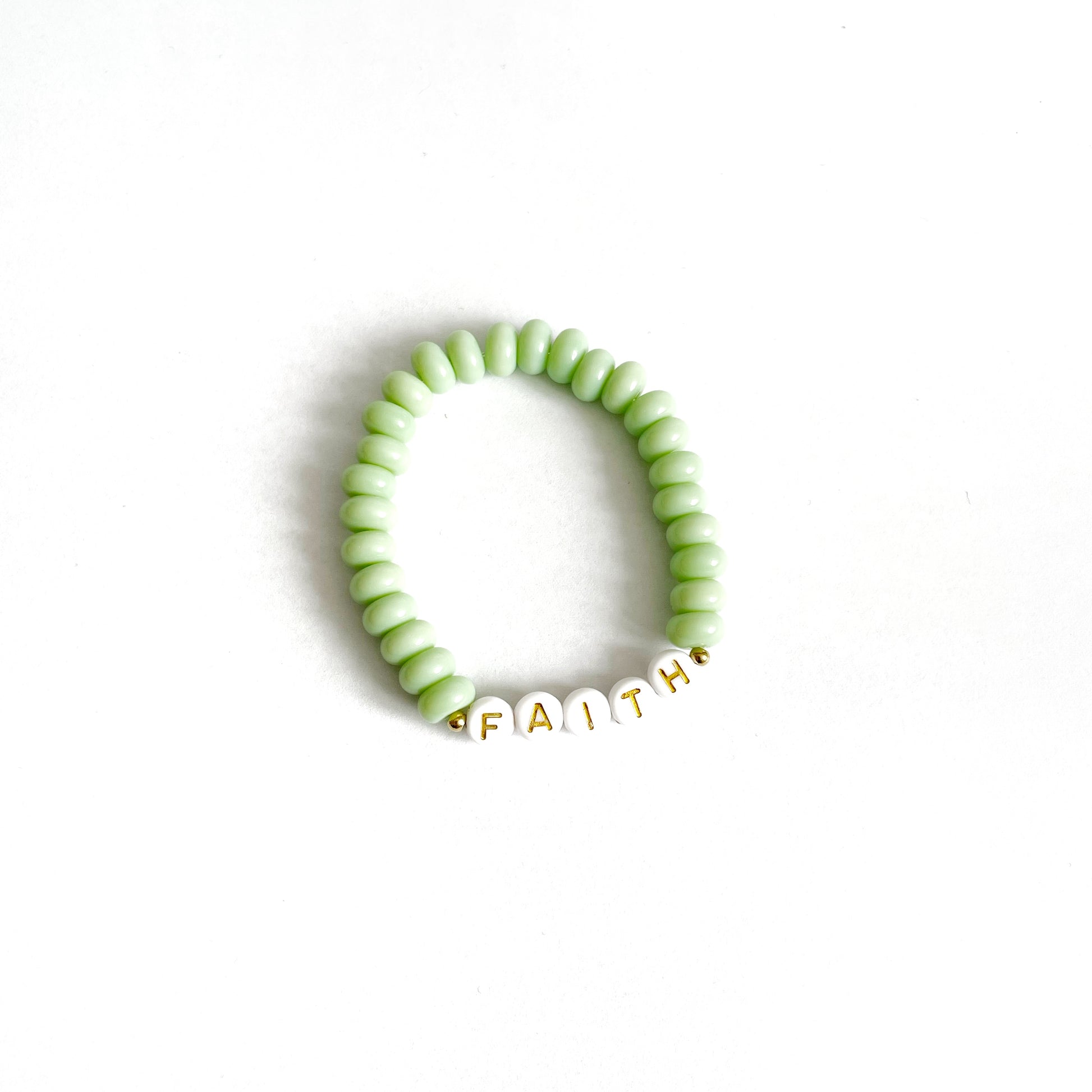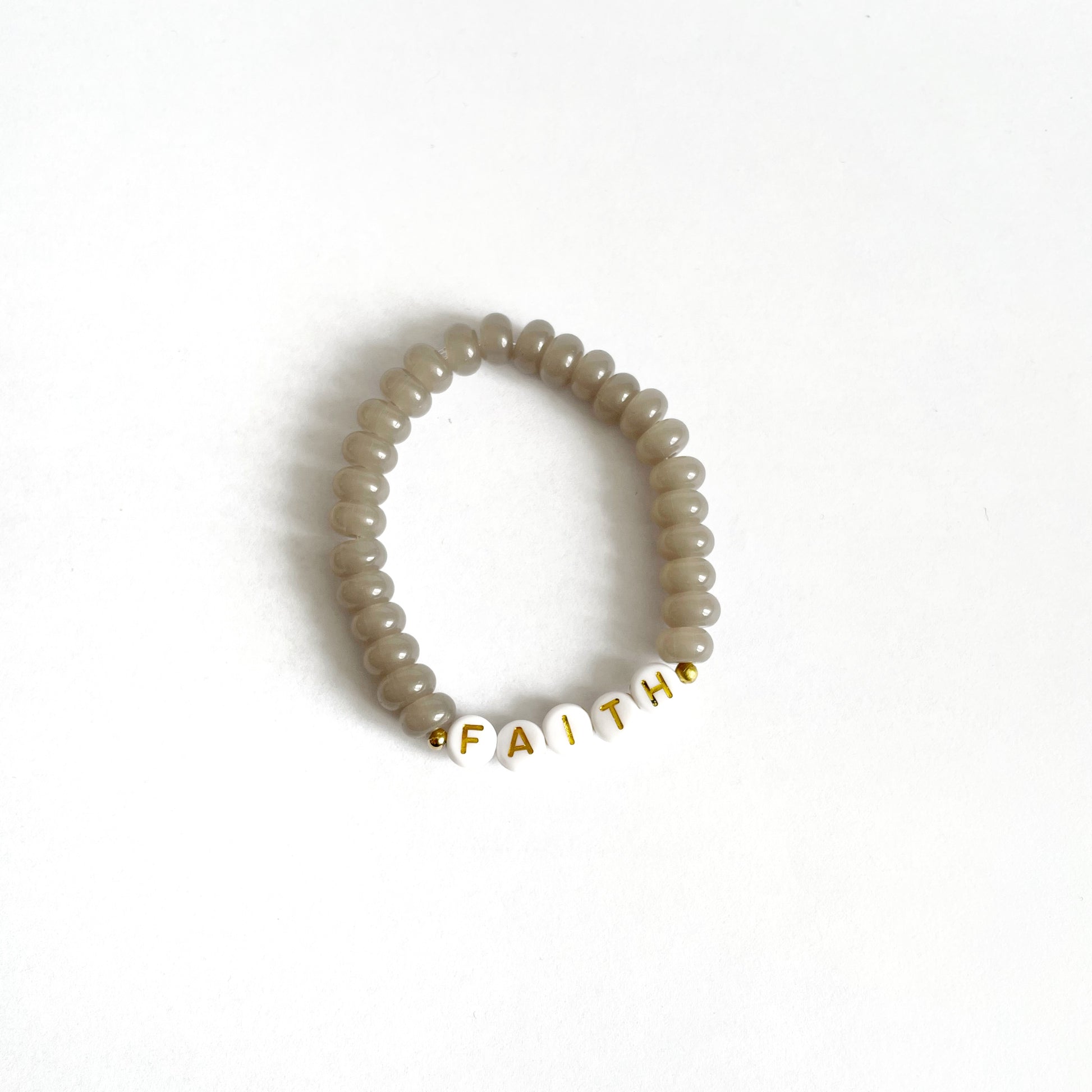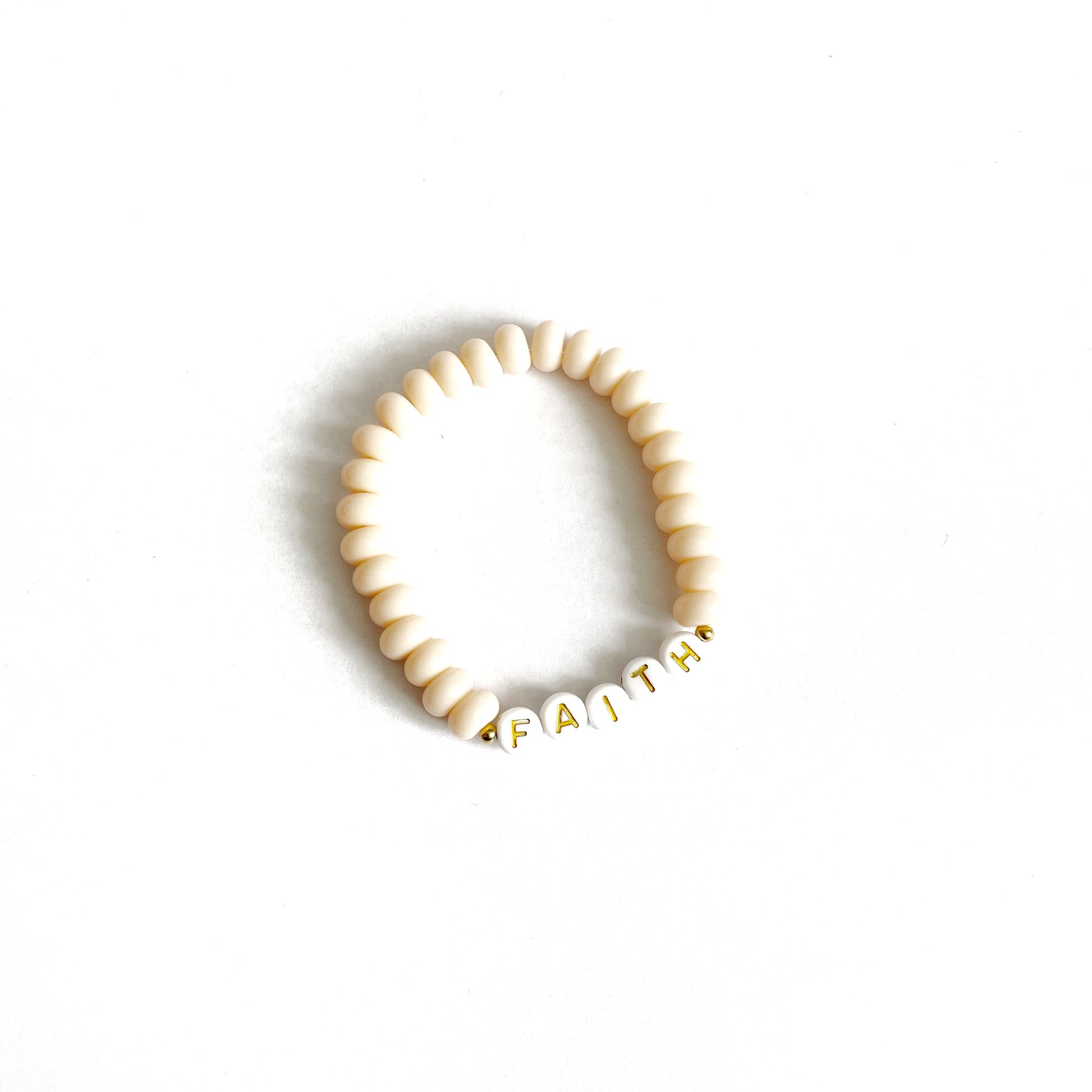 Bellas pulseras Faith en letras doradas con piedras en forma de donitas.