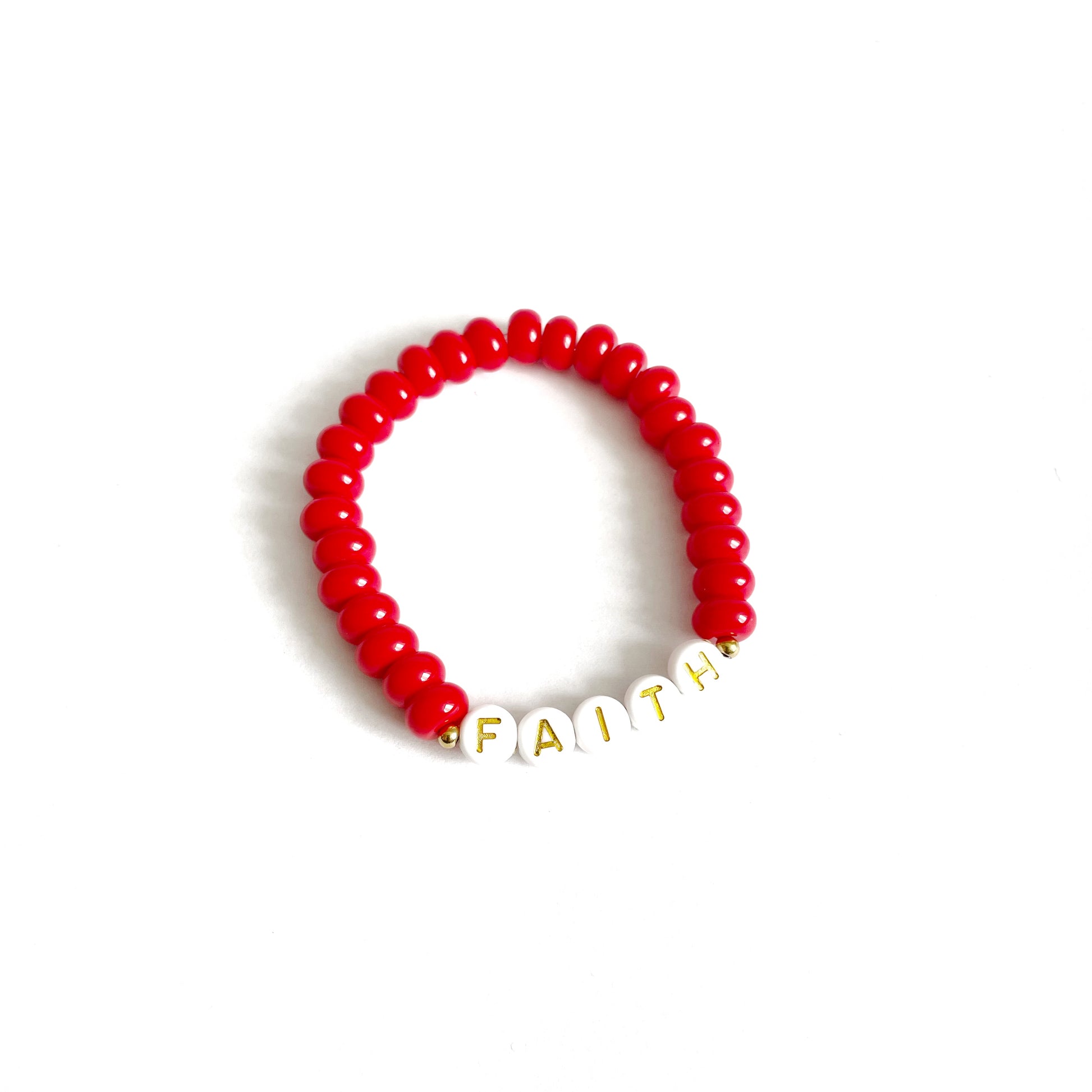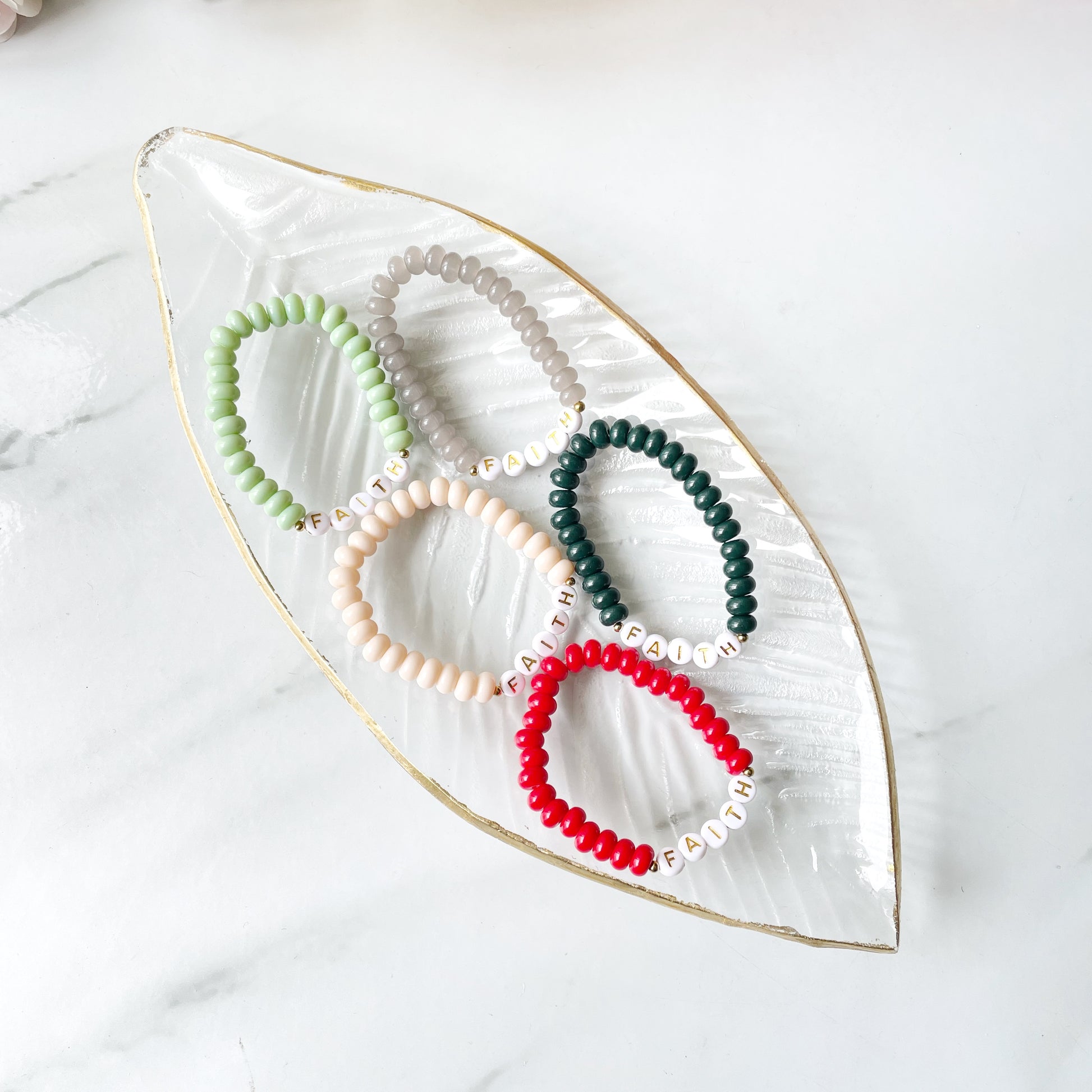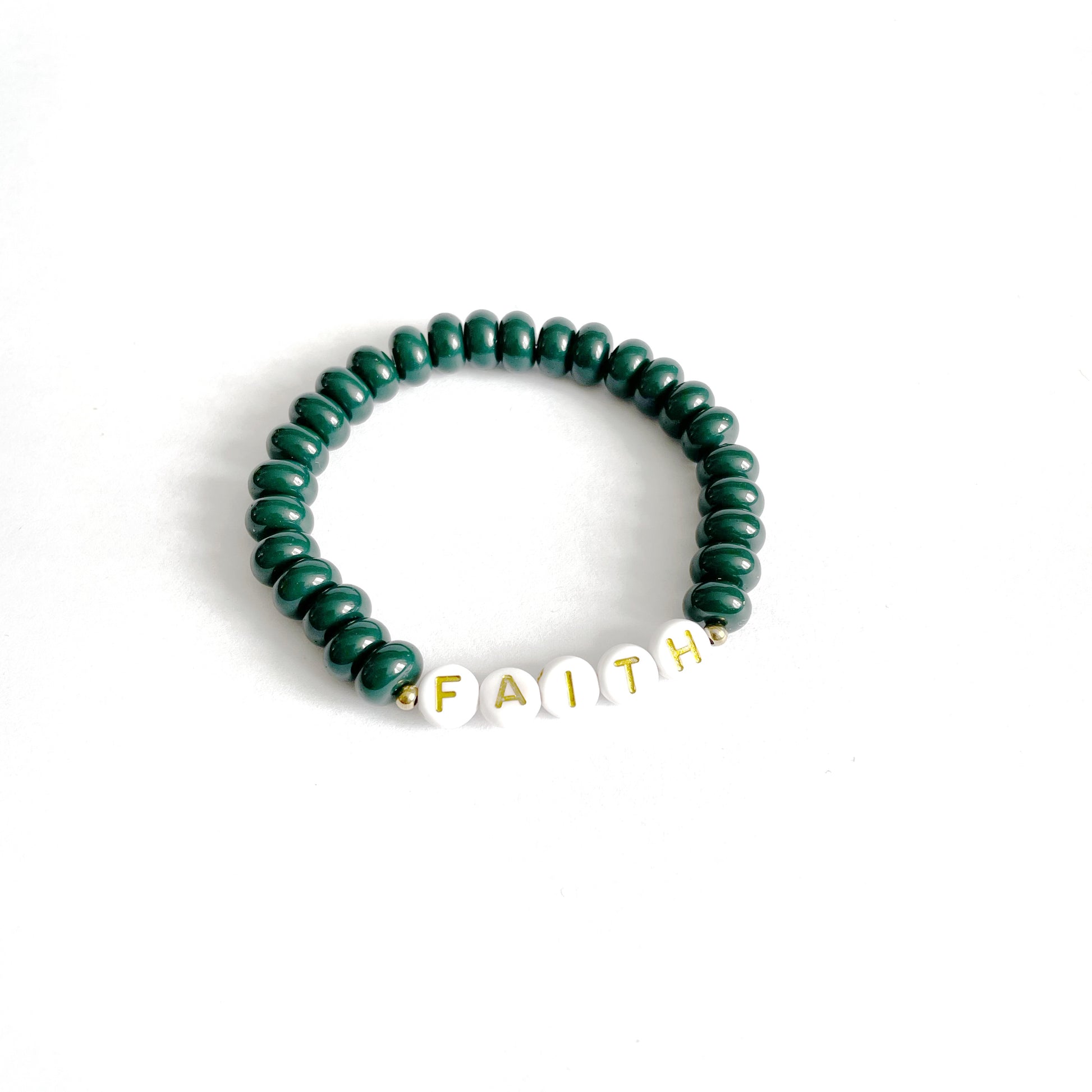 Bellas pulseras Faith en letras doradas con piedras en forma de donitas.