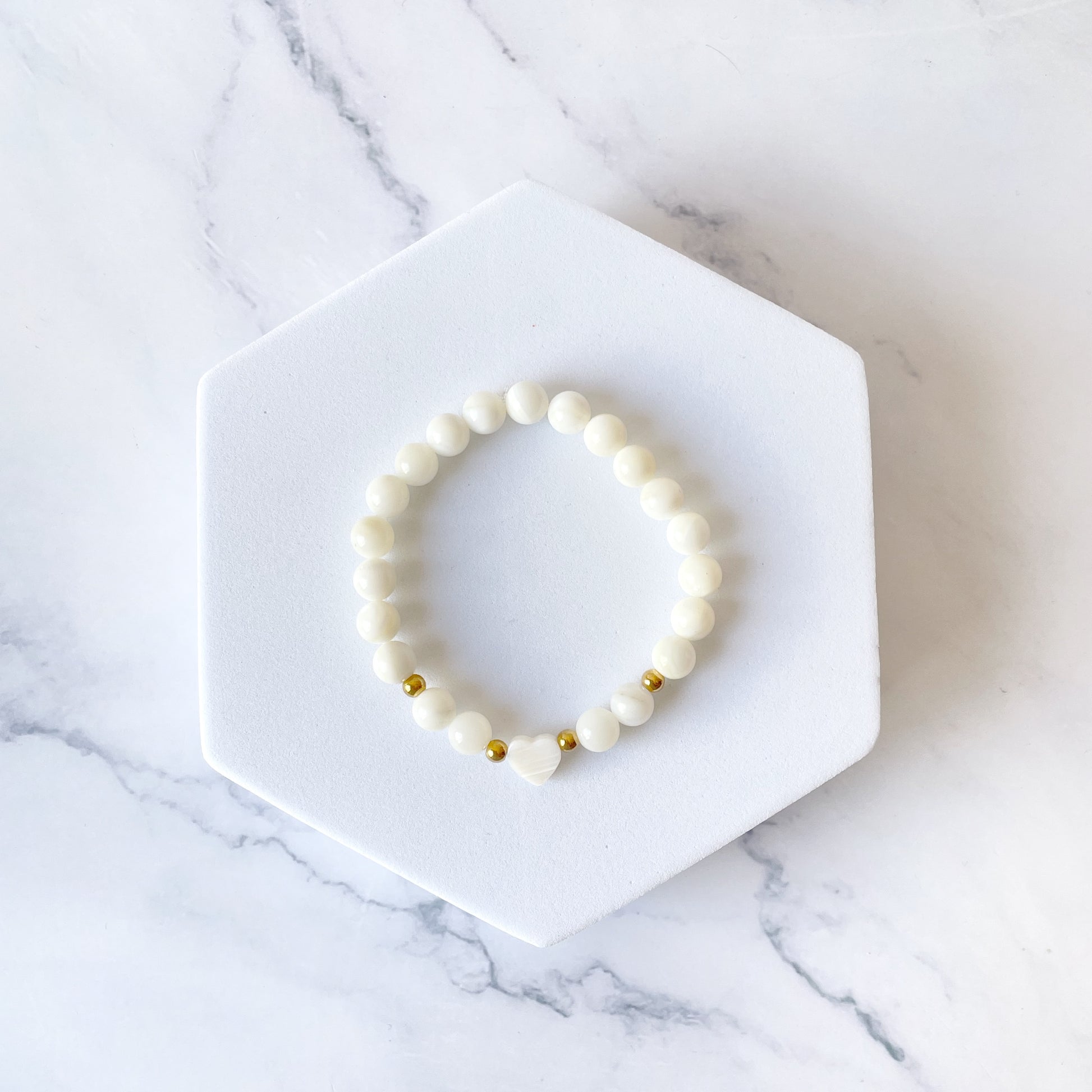 Bellas pulseras de piedras naturales con corazón de nácar y billas de acero, perfectas para levantar tu outfit y recordarte que guardes tu corazón ♥️
