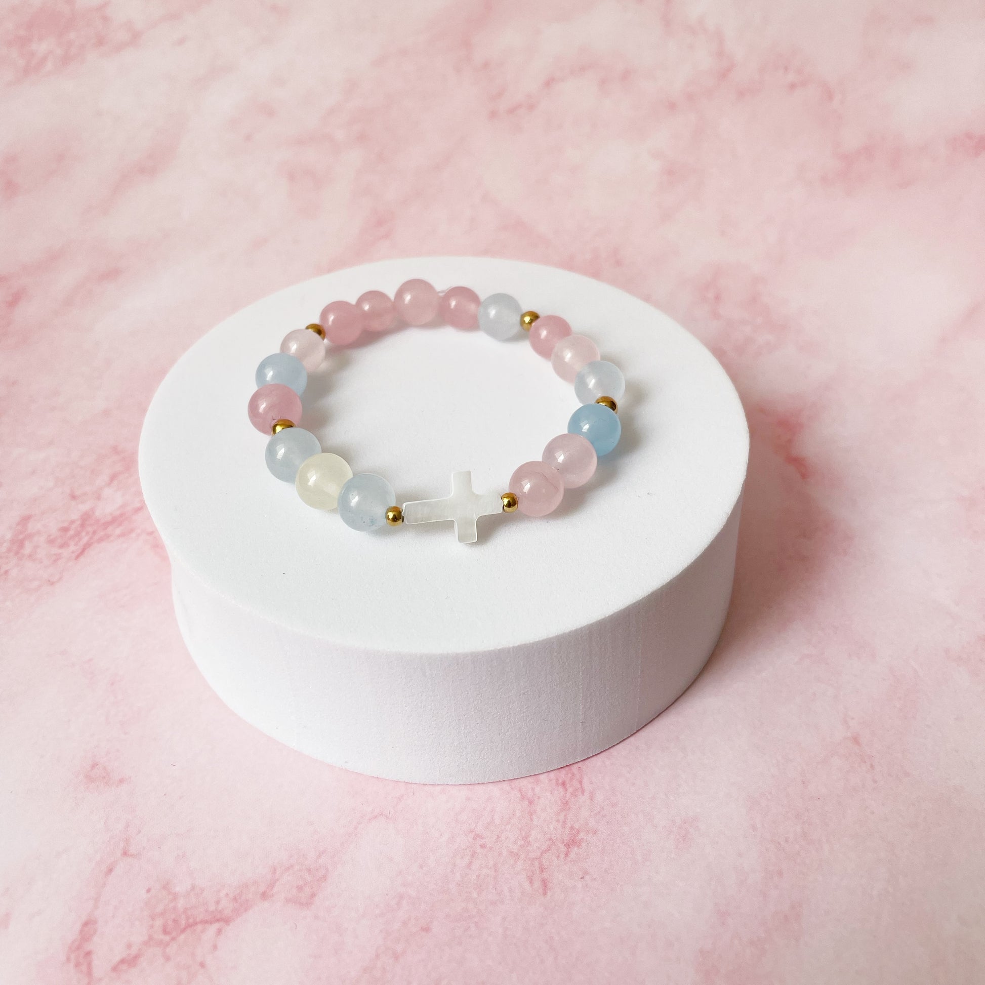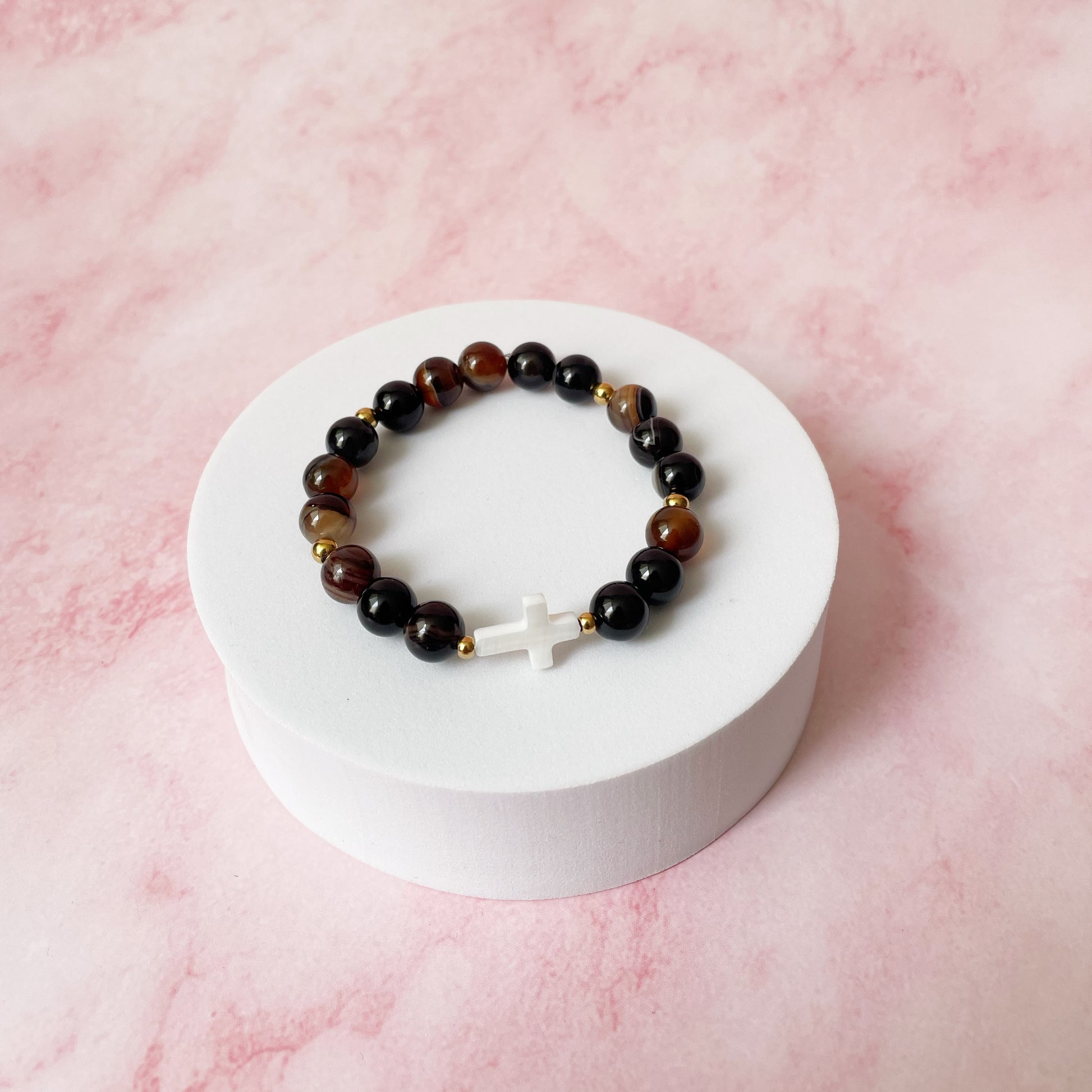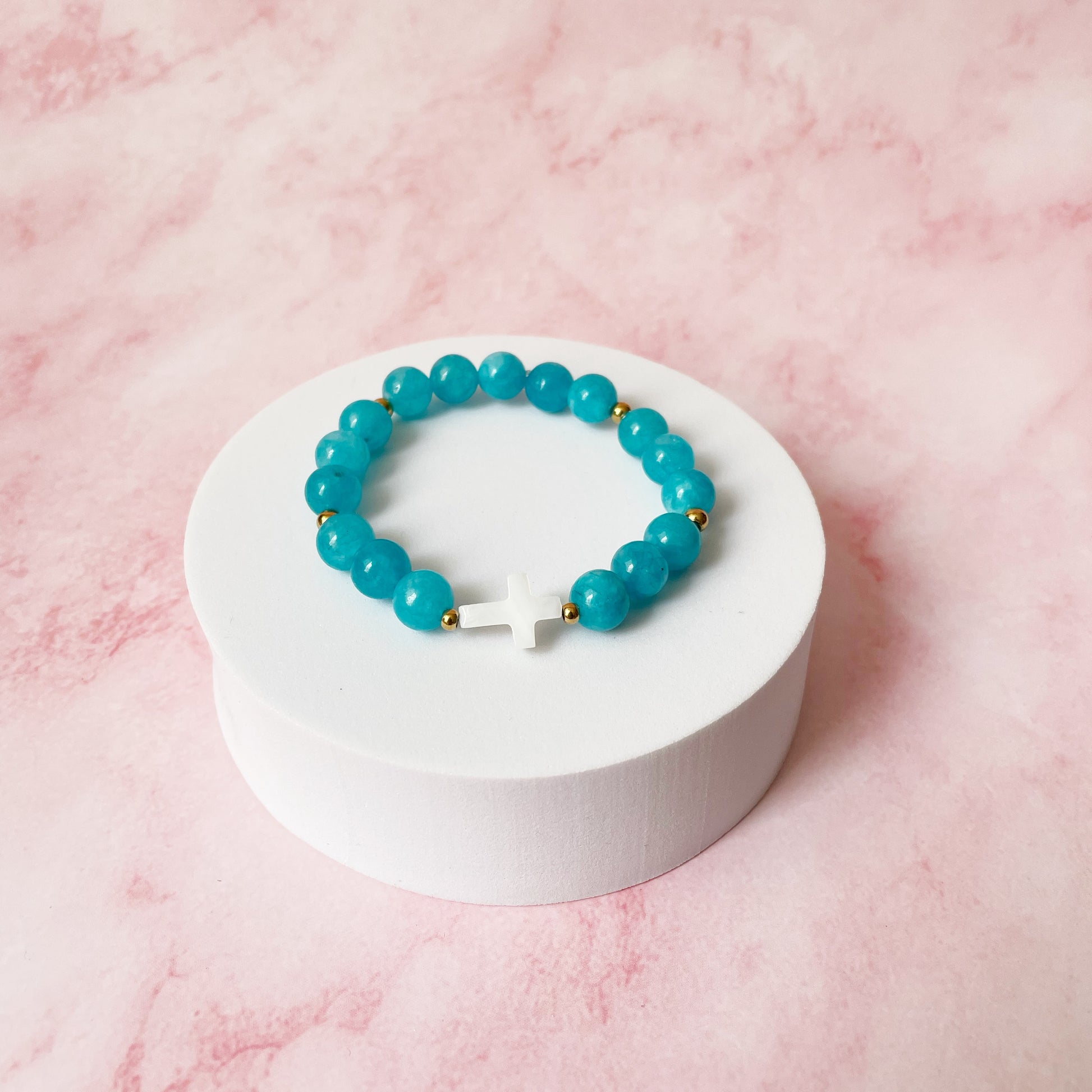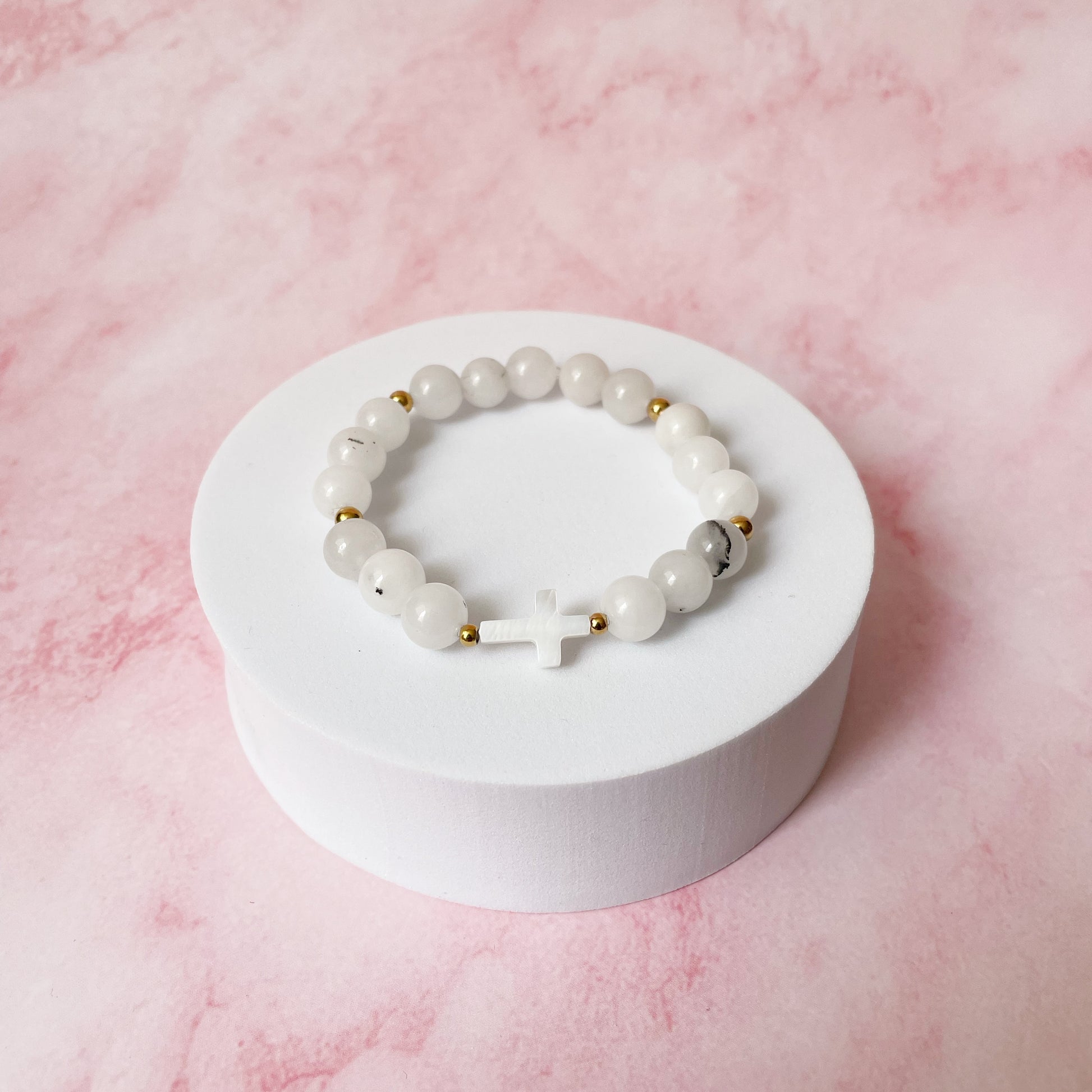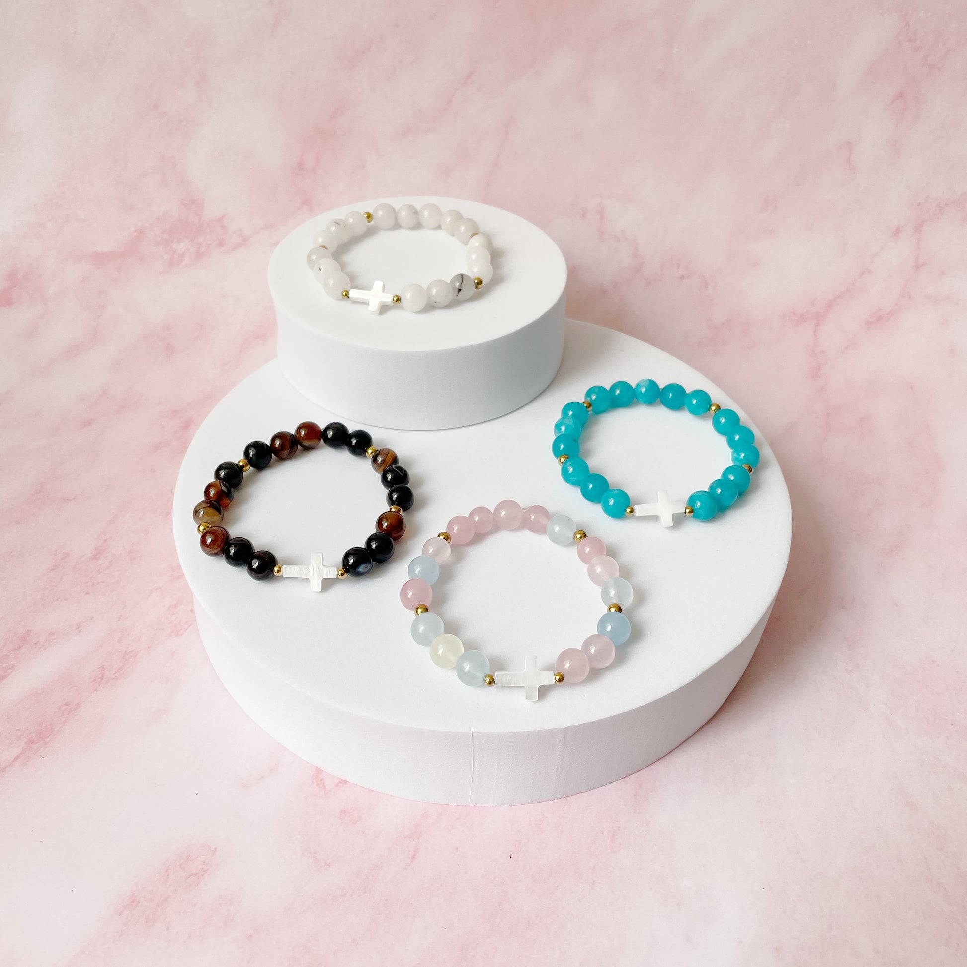 Bellas pulseras de cruz de nácar con piedras naturales.