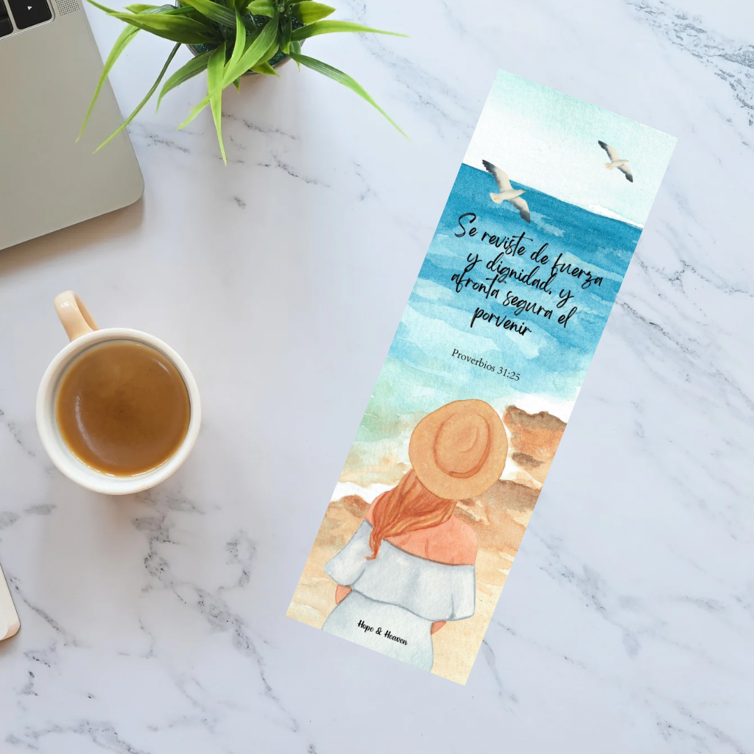 Separador con protector de mica para mayor durabilidad inspirado en proverbios 31:25