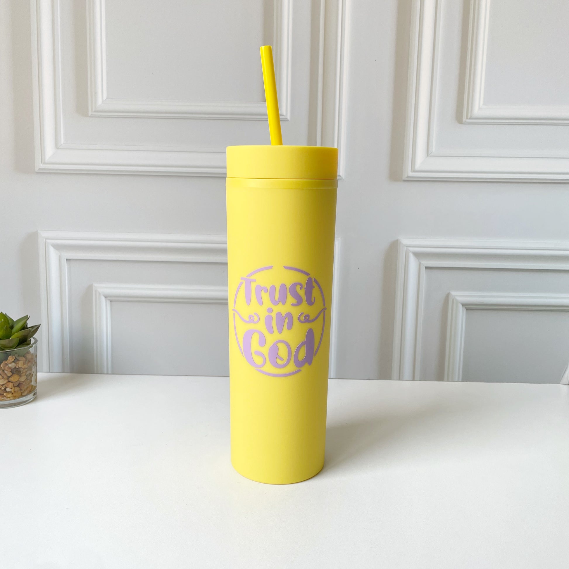 Hermosos tumblers en colores asthetic, con mensaje directo: Confía en Dios. Lleva el mensaje de una manera diferente y habla del amor de Dios y lo que hizo en tu vida.